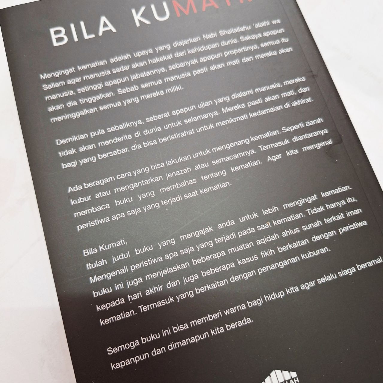 Itulah judul buku yang mengajak Anda untuk lebih mengingat kematian. Mengenali peristiwa apa saja yang terjadi pada saat kematian. Tidak hanya itu, buku ini juga menjelaskan beberapa muatan aqidah ahlus sunah terkait iman kepada hari akhir dan juga beberapa kasus fikih berkaitan dengan peristiwa kematian. Semoga buku ini bisa memberi warna bagi hidup kita agar selalu siaga beramal kapanpun dan dimanapun kita berada.
